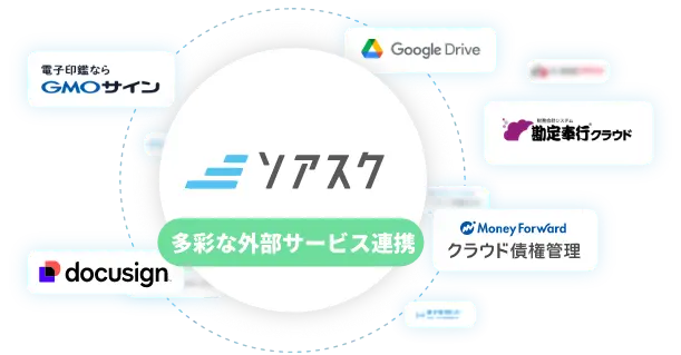 電子契約、クラウドストレージ、入金消込、会計などの各種サービスと柔軟に連携。煩雑な書類のやり取りや入金・会計処理を自動化し、手作業やミスを削減します。